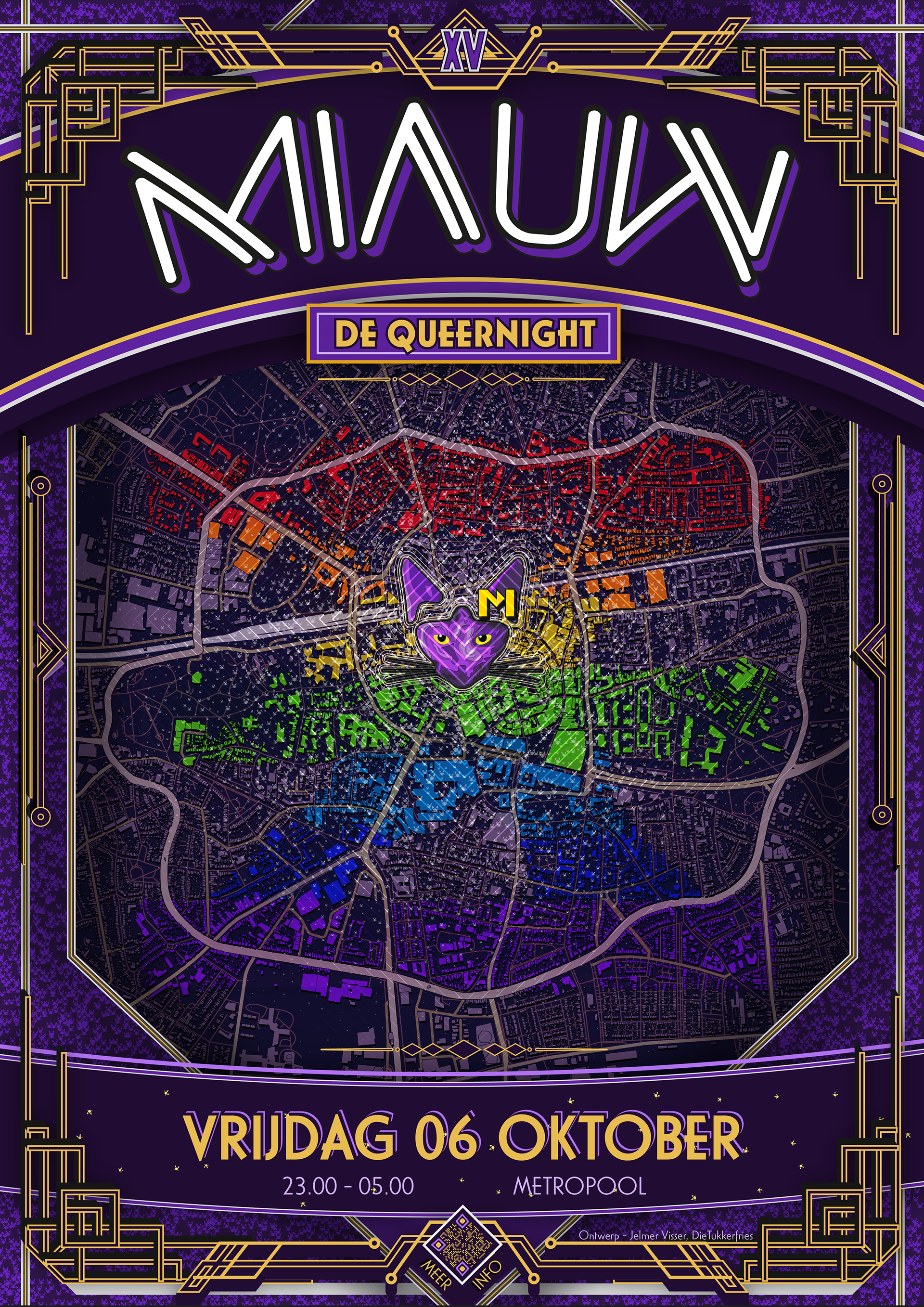 Hoewel grafisch ontwerp bij alle kaarten met een Kaartenhuijs-stempel een prominente rol vervult, kan bij fantasiewerelden de grafische trukendoos op volle kracht van het slot. De mogelijkheden zijn in principe eindeloos. Een goed voorbeeld is het kaartenduo van najaar 2023 voor MIAUW, een dance-evenement en een musical. Het resultaat is een duo aankondigingsposters die bij elkaar matchen, maar tegelijkertijd tegenpolen zijn.